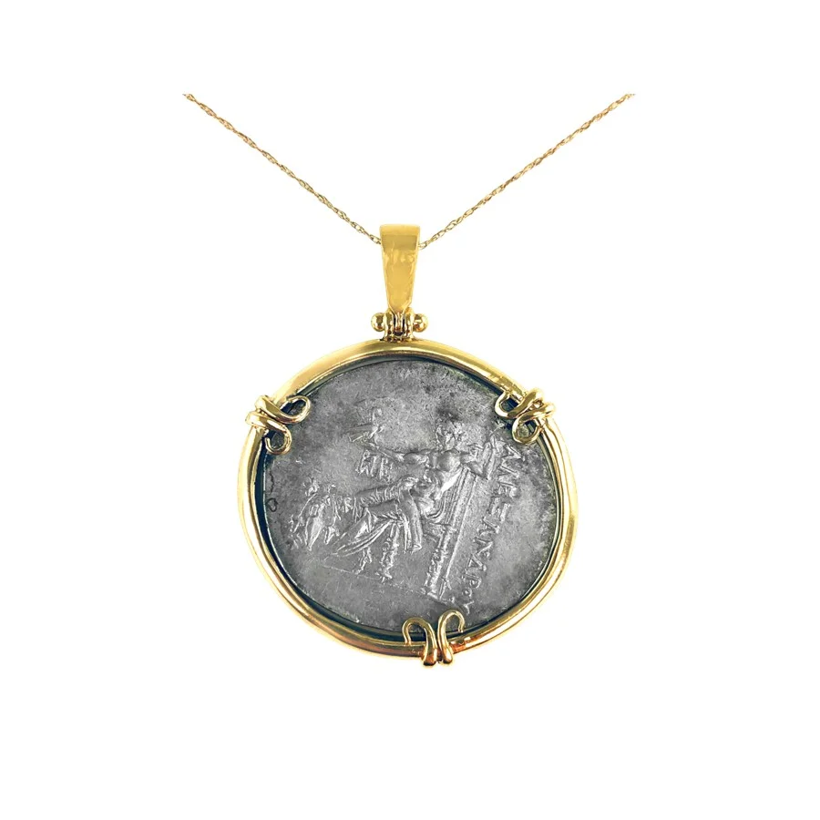 From the Kingdom of Macedon, this pendant has history written in metal. This is an Alexander III coin that shows the Head of Herakles wearing a lion-skinned headdress, while on the other side is Zeus enthroned and holding an Eagle. Set in 14k yellow gold.