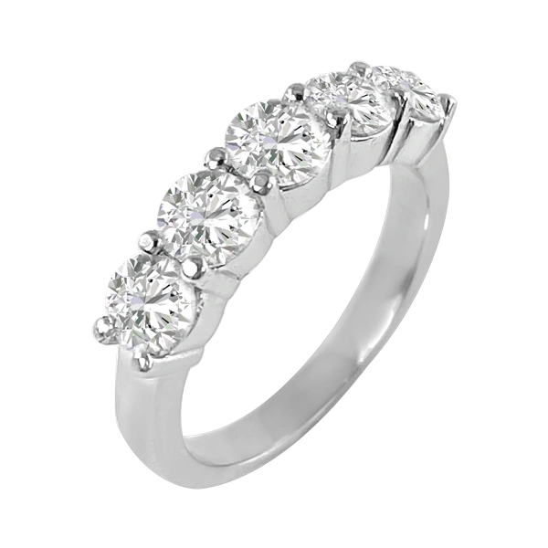 A beautiful white gold piece that would look good with white wine. This ring bubbles with excitement the more you look at it. With five diamonds total, it adds up to 1.75 carats that will sparkle beyond your expectations. Set in 14k white gold. Please call us if you need an alteration not offered here.