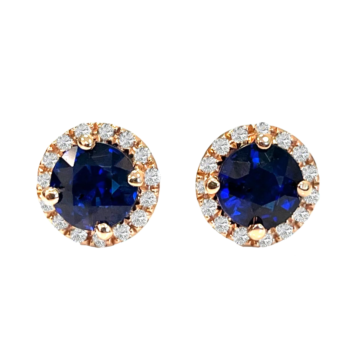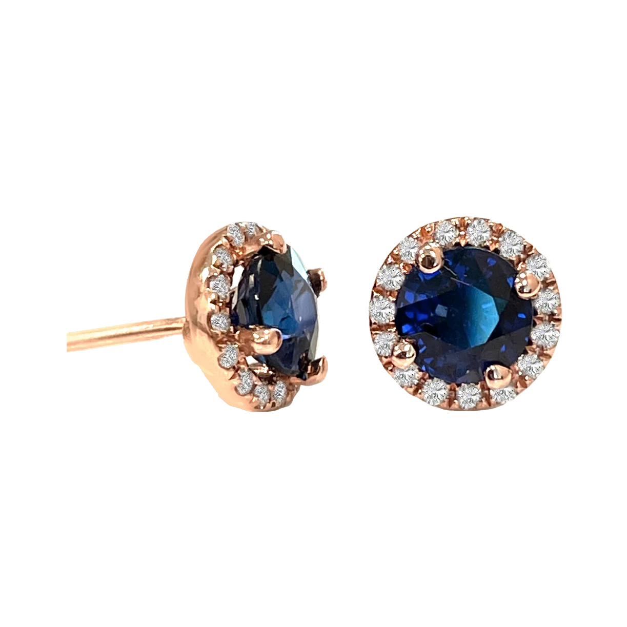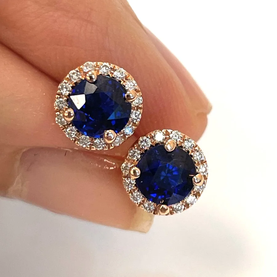 These diamond blue sapphire earrings are a beautiful statement for anyone wearing it. There are thirty H in color and SI in clarity diamonds that total .18 carats of beauty. The single sapphires in the middle of them are AAA in clarity, and they are a deep blue. It is 1.79 carats total. Set in 14k rose gold. Compare at $8,999.00 Please call us if you need any alterations not offered here.