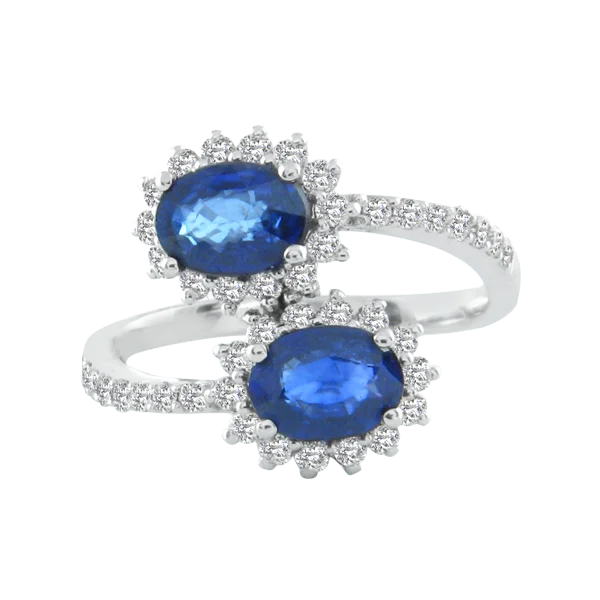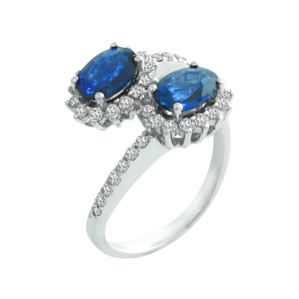 Another version of the “you and me” ring. Two wonderfully deep, rich blue sapphires totaling 2.02 carats in opposition to each other. The ring has a double halo and diamonds coming up both sides of the band for a total of 42 diamonds with a weight of .64 carats. In keeping with true quality, this ring was designed and cast in 18k white gold. Compare at $9,999.00