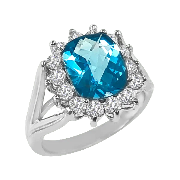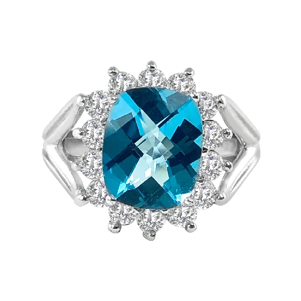 What would the queen wear? From our Crown City collection, this blue topaz ring is of top tier quality. AAAA in clarity, this oval-shaped blue topaz is attended by a halo of nearly perfect diamonds. Fourteen F in color and VS in clarity diamonds total .5 carats of diamond weight. Enjoy a different reflection at every angle when viewing the checkerboard cut of this magnificent topaz. The signature Crown City Collection split shank completes this ring. Set in 18K white gold. Compare at $9,999.00.