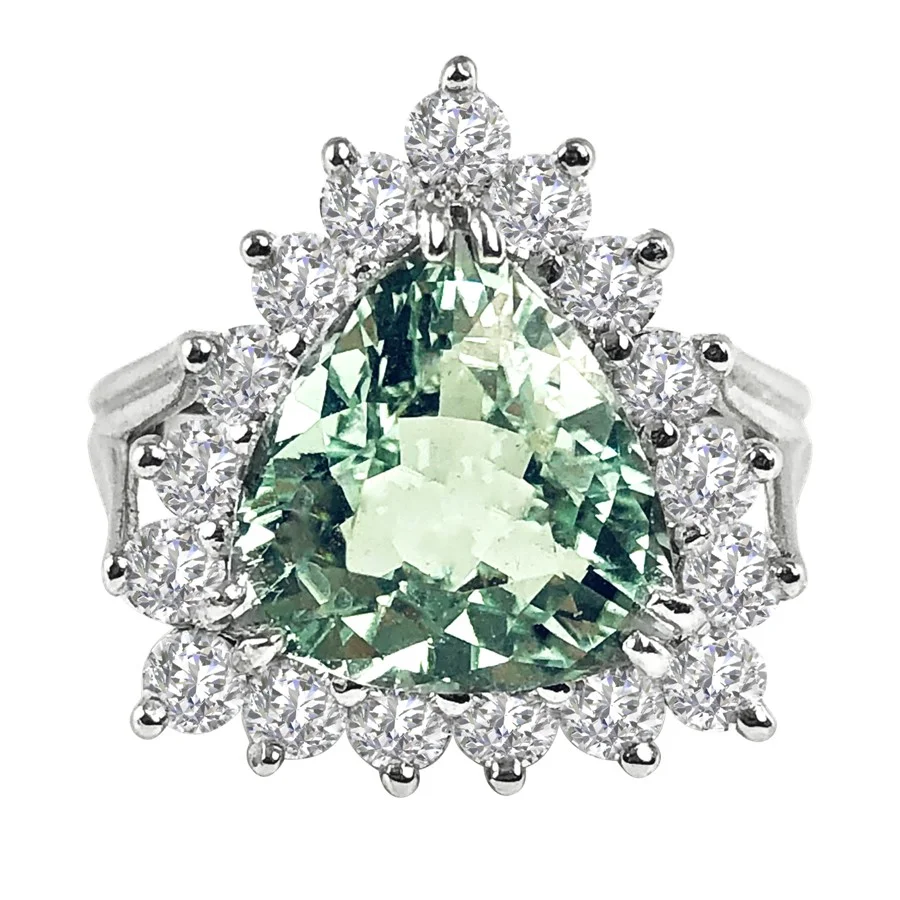 What would the queen wear? From our Crown City collection, this lovely blue-green tourmaline is ringed by seventeen F in color and VS in clarity diamonds that total 1.1 carats. This Paraiba type color is prized by many. A gem-quality trilliant cut, the star of this show weighs in at 4.28 carats and offers a wonderful world of light green and blue. Exhibiting the signature shank from our Crown City collection, this splendid ring is set in 18k white gold. Compare at $8,199