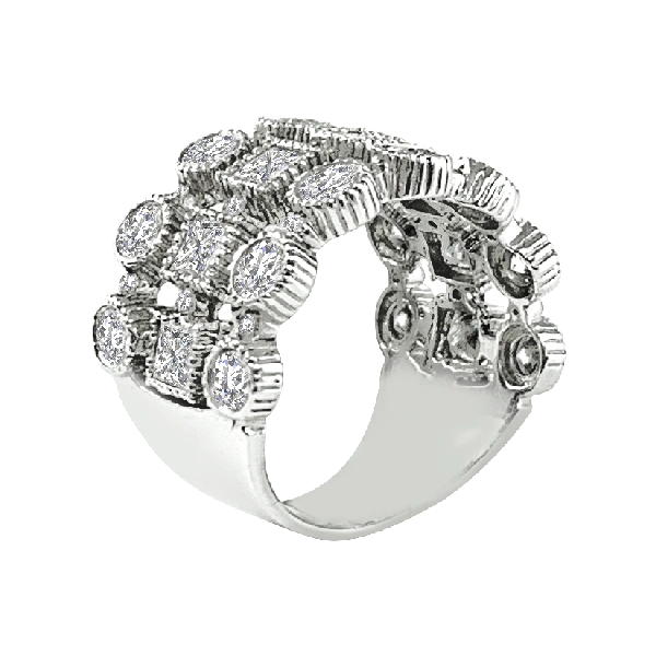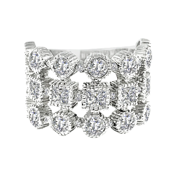 This ring shows such an artistic wave of creativity. This cocktail band consists of twenty-one princess and round cut diamonds that weigh 2.75 carats total. The color and clarity of these stones are H and SI. Set in 14k white gold. Compare at $9,399.00 Please call us if you need an alteration not offered here.