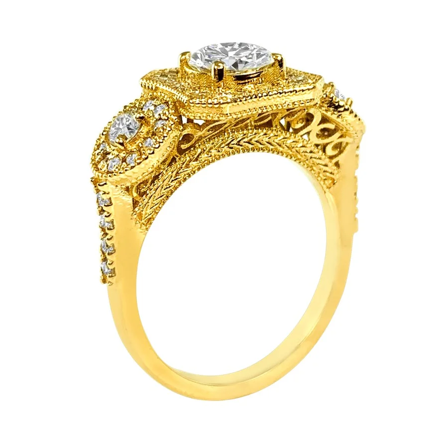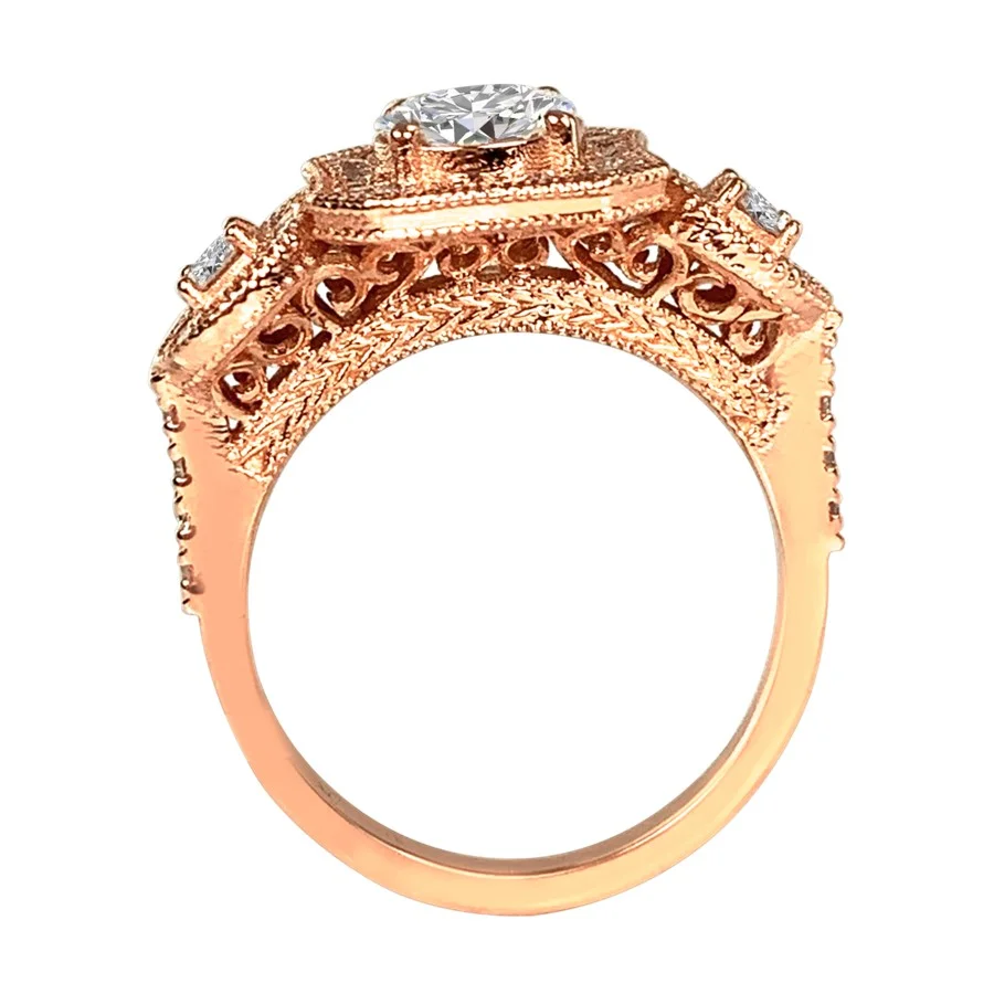 Big and bold, this deco inspired engagement ring shows stunning detail and structure. With a one carat center stone that is H in color and SI in clarity, this ring dazzles beyond compare. Engraved details on the finger bridge lend context to your story. Fifty diamonds encrust this piece, adding.5 carats for a 1.8 carats total diamond weight. Set in 18k rose gold. Compare at 43,999.00 Please call us if you need any alterations made to this piece.
