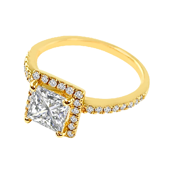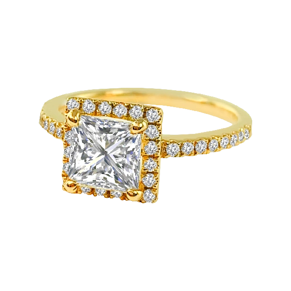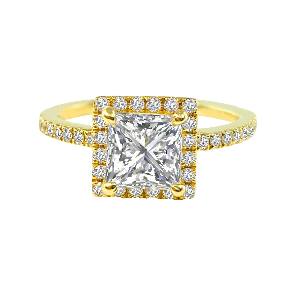 A princess cut for a princess! This ring is truly a stunner. The center diamond is H in color and VS in clarity. It totals 1.52 carats. The surrounding diamonds weigh .3 carats. Like the center stone, these thirty-six diamonds are H in color and SI in clarity. A truly dazzling engagement ring. Set in 14k yellow gold. Compare at $49,900.00 Please call us if you need an alteration not offered here.