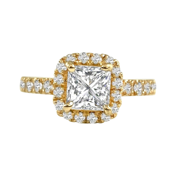 With a center stone of 1.15 carats, this ring is made to excite. What`s more exciting is that the stone is H in color and SI3 in clarity. Surrounding this wonderous stone are twenty-eight H in color and SI in clarity diamonds that weigh a total of .59 carats. Set in 18k yellow gold. Please call us if you need any alterations made to this piece.