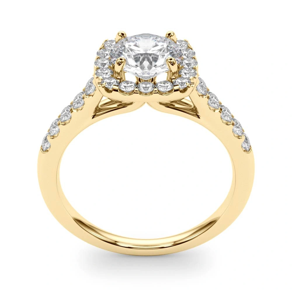 With a center stone of 1.09 carats, this ring is made to excite. What`s more exciting is that the stone is E in color and SI2 in clarity. This diamond was deemed truly exceptional by GIA which is why this diamond here is certified. Surrounding this wonderous stone are twenty-six H in color and SI in clarity diamonds that weigh a total of .57 carats. Set in 18k yellow gold. Please call us if you need any alterations made to this piece. Available in semi mount. Call for price.