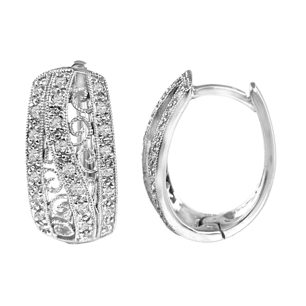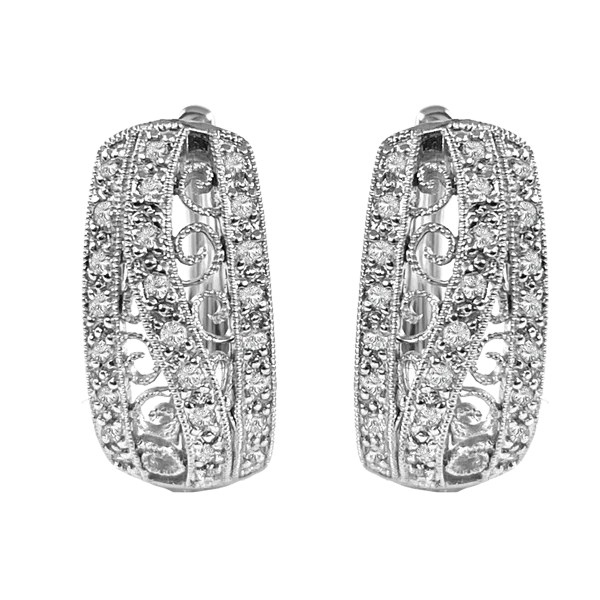 This intricate artwork is a display of how beautiful and complicated the filigree and milgrain designs can be. There are twenty-six diamonds that weigh .5 carats. These H in color and SI in clarity diamonds compliment the look of these stunning earrings. Set in 14k white gold. Compare at $1,499.00