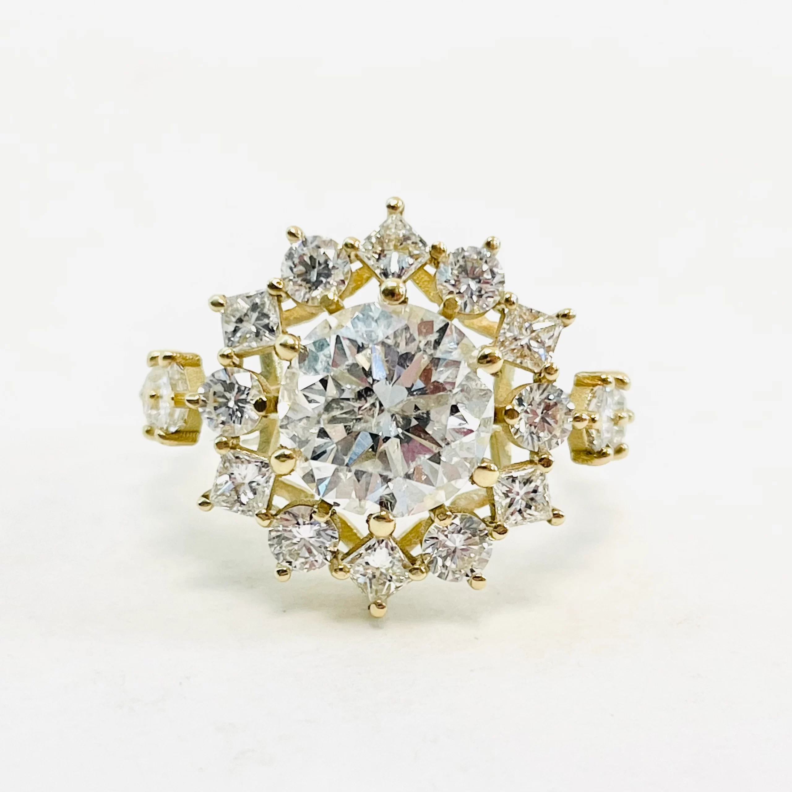From our New Collections, this ring is part of our Terrazza line which is the prime of luxury. This ring has a whopping 3.35 carat diamond in the center which is I in color and I2 in clarity. This center stone is GIA Certified as well. Surrounding this alluring stone are almost three carats of round and princess cut diamonds.