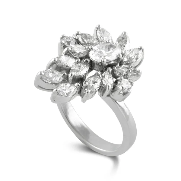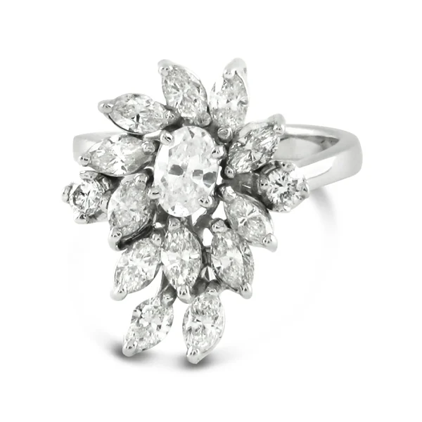 An elegant couture leaf. The center stone is .7 carats surrounded by fourteen G in color marquise diamonds totaling another 1.7 carats. Almost 2.5 carats of diamonds create the perfect shimmering leaf. A true designers piece set in 18k white gold. Compare at $11,900.00 Please call us if you need alterations not offered here.