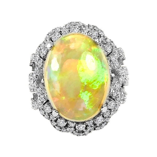 An opal fit for a queen– or king. The halo surrounding this stone offers a Victorian design that will take any person back to Windsor Castle– even if they have never visited. The opal in the middle is 6.07 carats and AAA in clarity. The stone is 14X12 in dimension. A truly spectacular ring. Set in 14k white gold. Compare at $10,999.00
