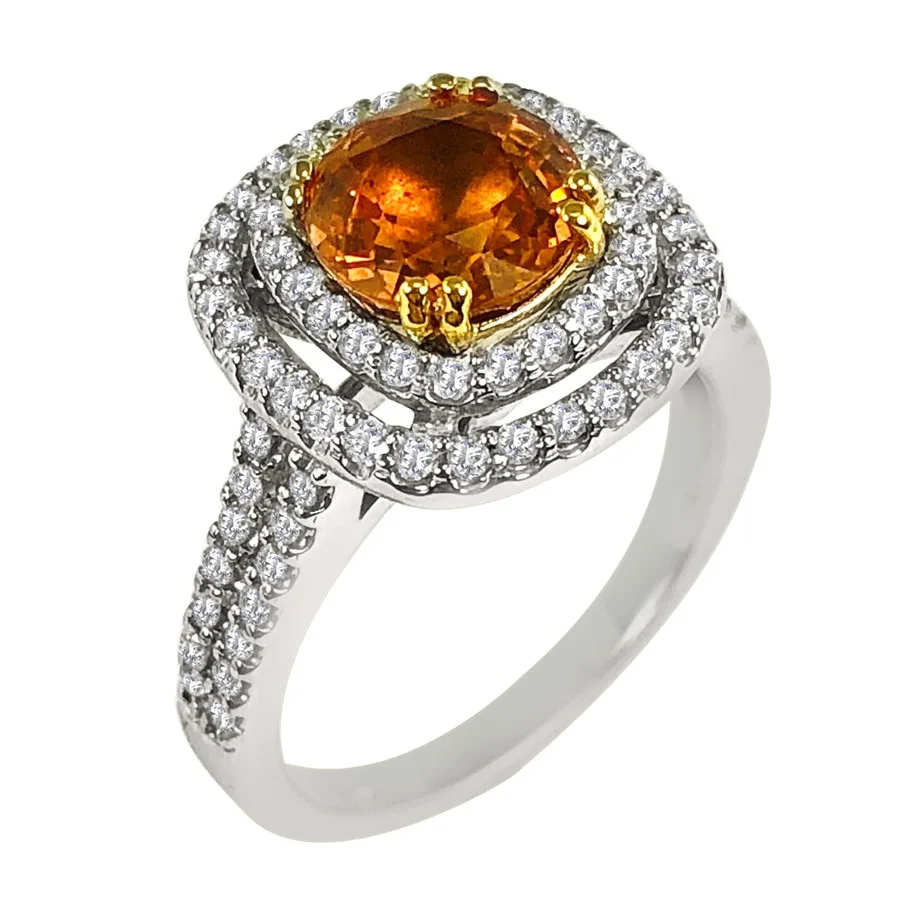 They say that orange is the new black, and this ring proves that statement. With a double halo of eighty diamonds, the total diamond weight is .7 carats. The two and a half carat orange sapphire is AAA in clarity and is a fiery stone that lights up a room. Set in 14k white gold. Compare at $11,999.00