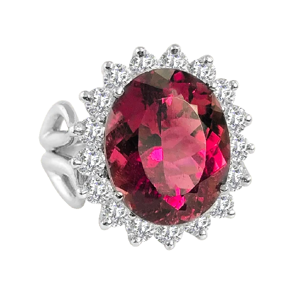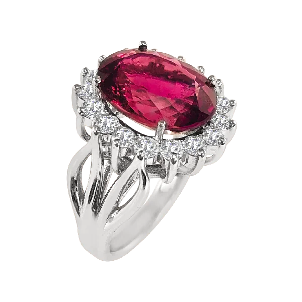 From our Crown City collection, this pink tourmaline ring is of top-tier quality. The stone is 7.7 carats. There are eighteen F in color and VS in clarity diamonds that total over one carat. The split shank makes this ring even more complete. Set in 18k white gold. Compare at $14,999.00