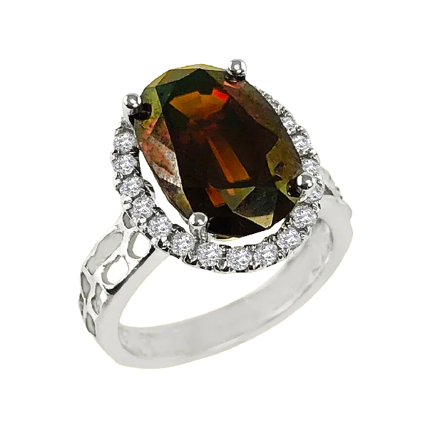 This red zircon ring has a gorgeous design like no other. There are twenty-two diamonds surrounding this 8.8 carat stone, and the total diamond weight is .5 carats. The color of the diamonds is H in color and SI in clarity. Set in 14k white gold. Compare $9,999.00