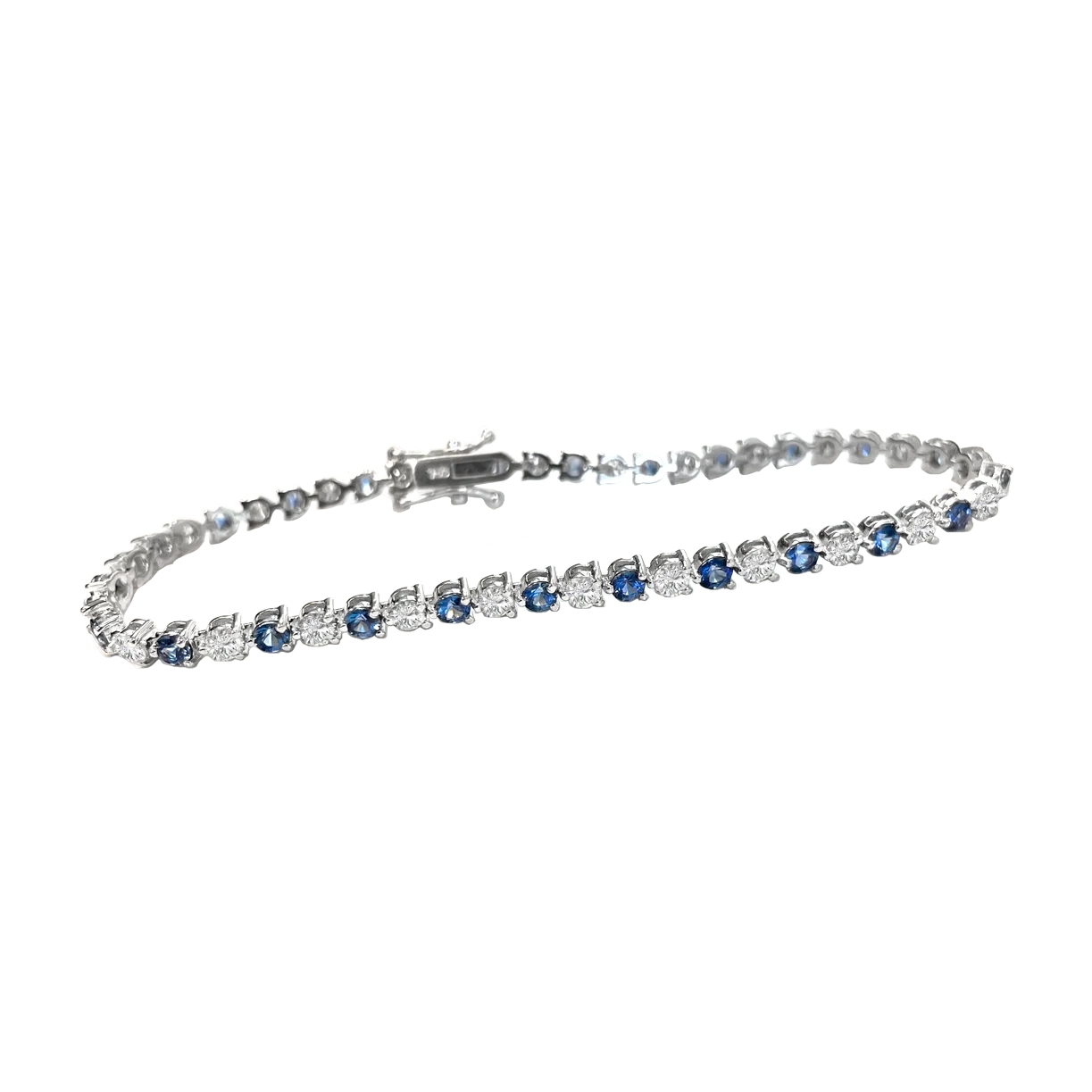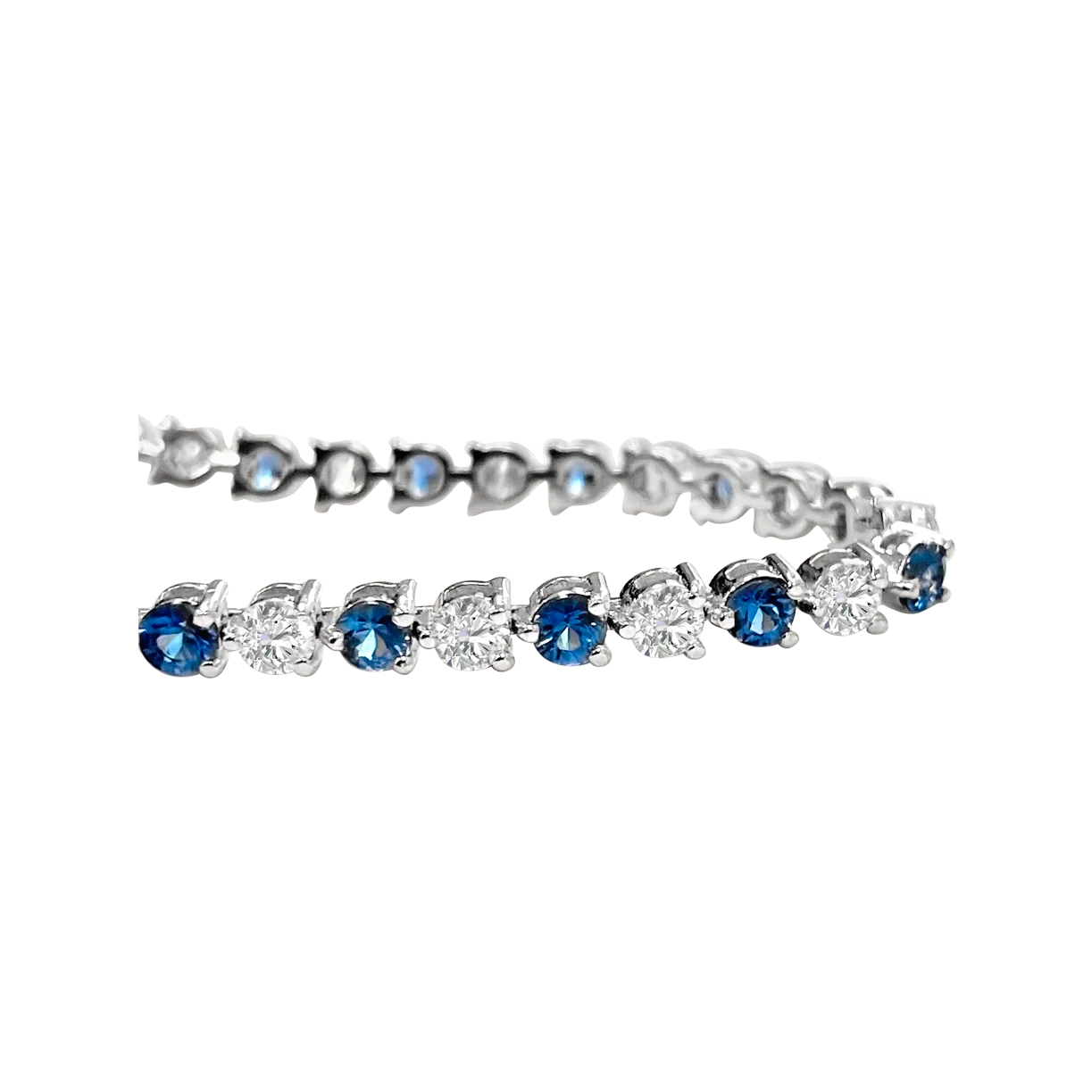 This diamond blue sapphire bracelet drips with luxury. There are twenty-four diamonds total that weigh 2.5 carats. There are twenty-four AAA in clarity blue sapphires included in this ring as well. These sapphires total a carat weight of two carats! Set in 18k white gold. Compare at $14,999.00 Please call us if you need any alterations not offered here.