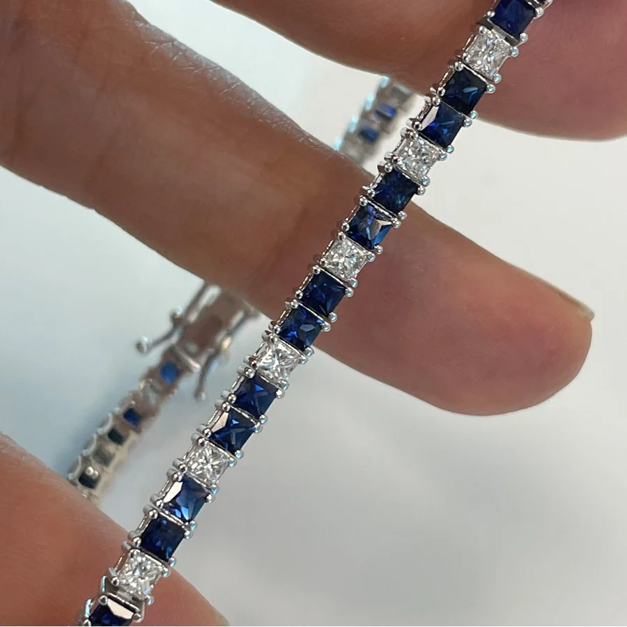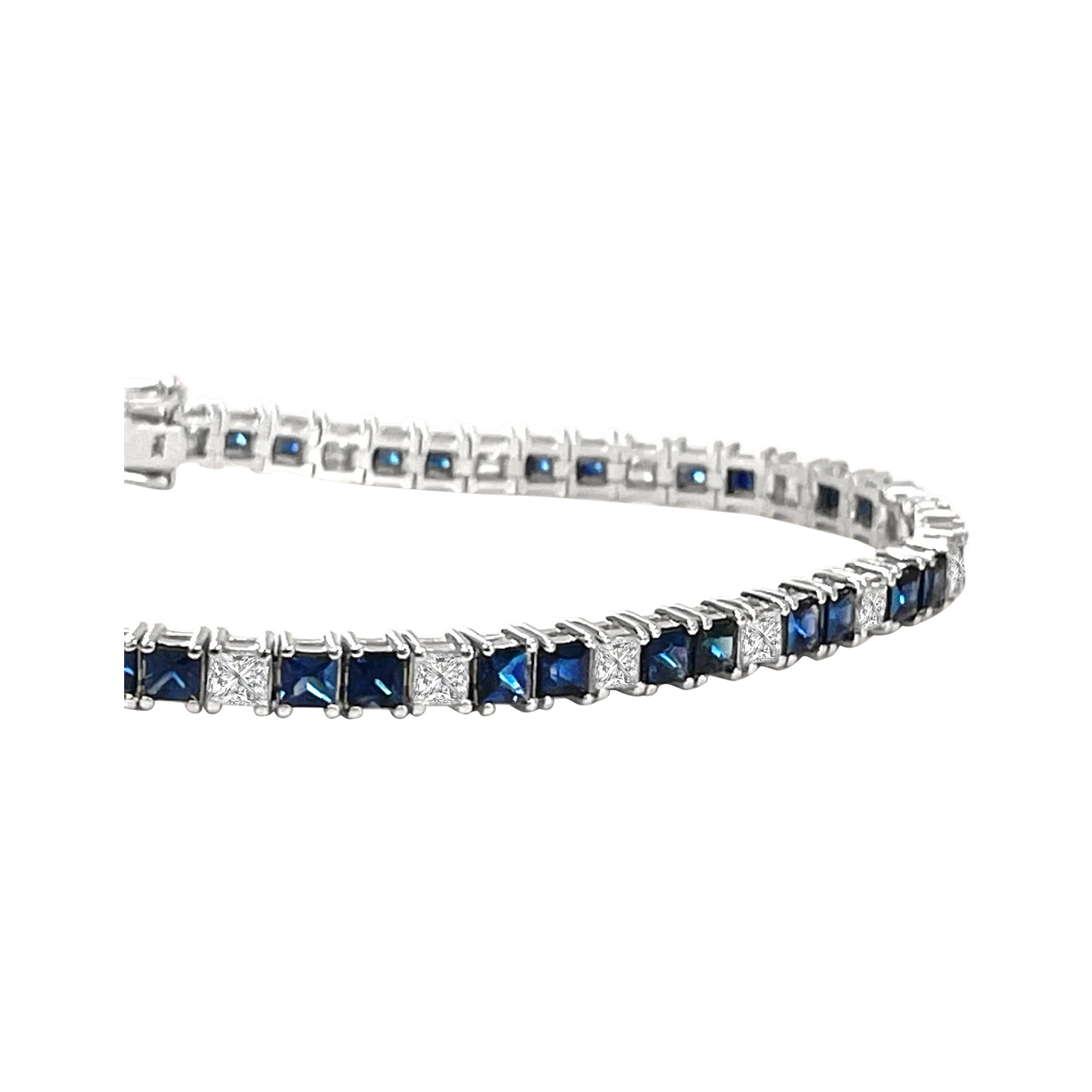 This diamond blue sapphire bracelet drips with luxury. There are 21 diamonds total that weigh 1.75 carats. There are 40 AAA clarity blue sapphires included in this ring as well. These sapphires total a carat weight of 6 carats! All set in 14k white gold. Compare at $17,999.00