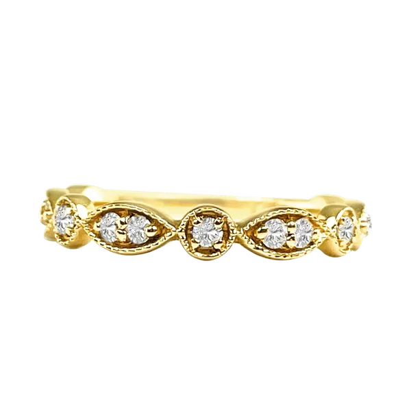 A beautiful stacking ring. This bubbly diamond stacking ring is 14K yellow gold. This ring has thirteen H in color and SI in clarity diamonds that total .25 carats in weight. A simplistic beauty. Compare at $1,999.00 Please call us if you need alterations not offered here.
