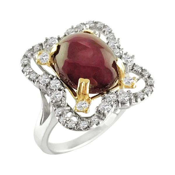 This ruby ring was made for a person who strives to be a star. With an 8.5 carat star ruby in the center of thirty-six H in color and SI in clarity diamonds, this ring has a statement to make. The total carat weight of the diamonds are .73 carats total. Set in 14k white gold. Compare at $19,999.00
