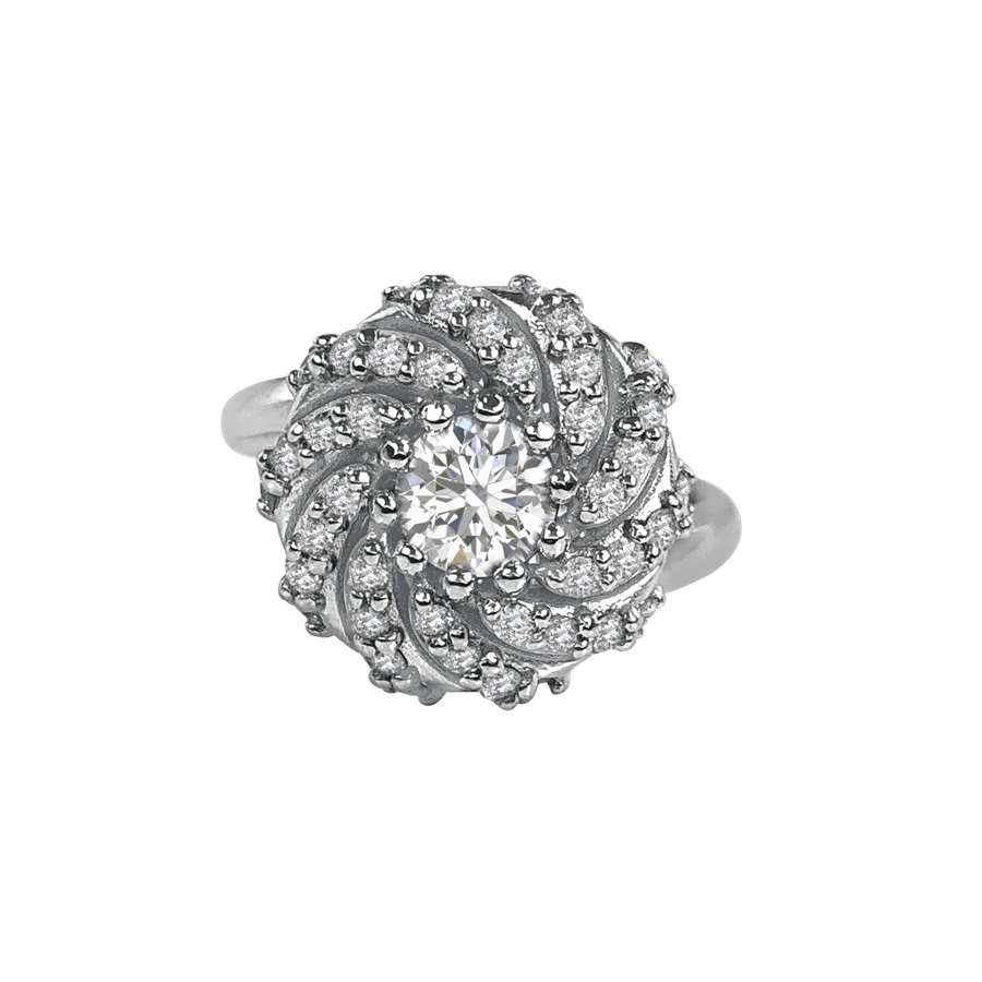 If you attack life with the force of a tornado, this ring is your “coat of arms.” There is a center stone of .56 carats that is H in color and SI in clarity. The surrounding stones are .89 carats of H in color and SI in clarity diamonds. Set in 14k white gold. Compare at $8,499.00 Please call us if you need any alterations made to this piece.