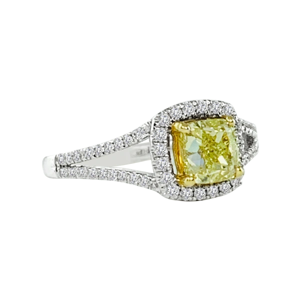 A diamond of substance. This beauty of a ring has a fancy yellow, GIA certified one carat diamond. With forty-four H in color and SI in clarity diamonds, there is a .25 carat halo surrounding this wonder of a stone. Set in 14k white gold. Compare at $17,999.00 Please call us if you need an alteration not offered here.