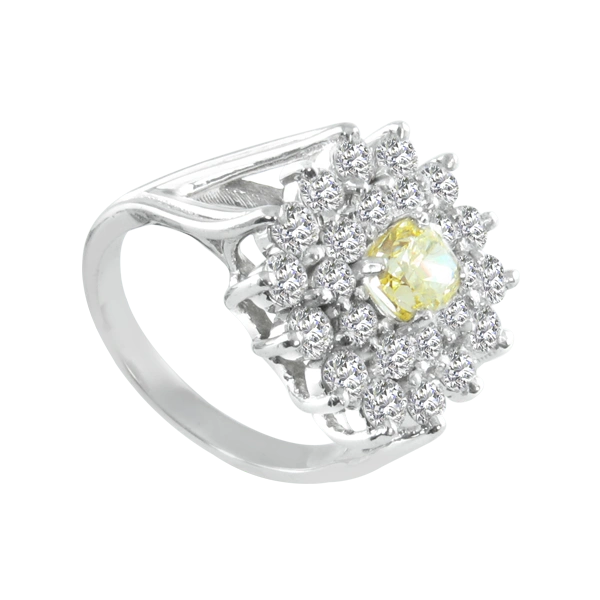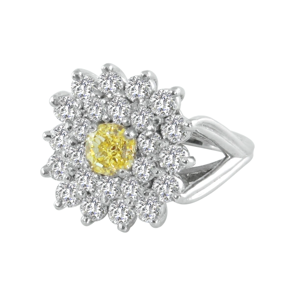 Fancy colored diamonds are diamonds of substance. This beauty of a ring has a fancy yellow, GIA certified .78 carat diamond that is VS in clarity. This magnificent stone is surrounded by a 1.6 carat diamond halo constructed with twenty-four F in color and VS in clarity diamonds. This ring will follow you to the most extravagant cocktail parties and the summer nights in Paris. Set in 18k white gold. Compare at $22,999.00 Please call us if you need an alteration not offered here. GIA 2121787235